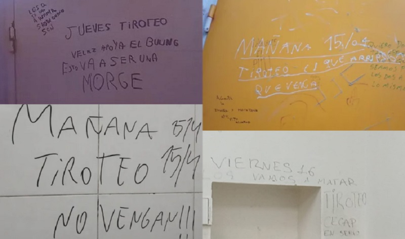 La causa tuvo origen en la detección de inscripciones en el baño de varones del mencionado establecimiento, cuyo contenido —de carácter intimidante— hacía alusión a la eventual concreción de situaciones violentas al inicio de la semana, lo que generó preocupación en la comunidad educativa y motivó la inmediata intervención de las autoridades.